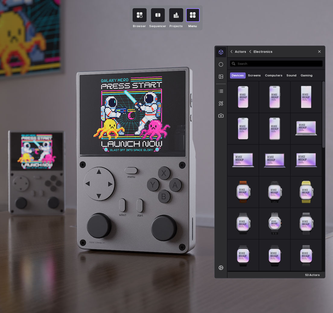 Spatial Stage includes over 500 drag-and-drop assets, like furniture, electronics, clothes, cars, packages, lights, plants, and more. Use decals to add logos, textures, or scratches to any surface.